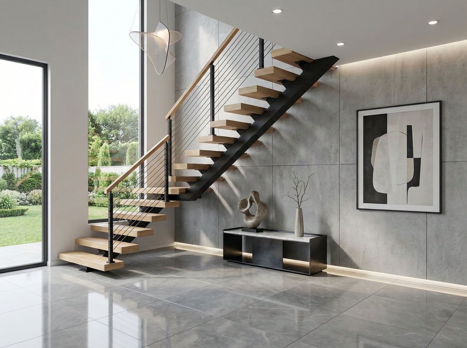 Mono or dual stringer design with upgraded steel, premium wood treads, and clean finishes. Compatible with cable or glass railing systems, with optional LED tread lighting.