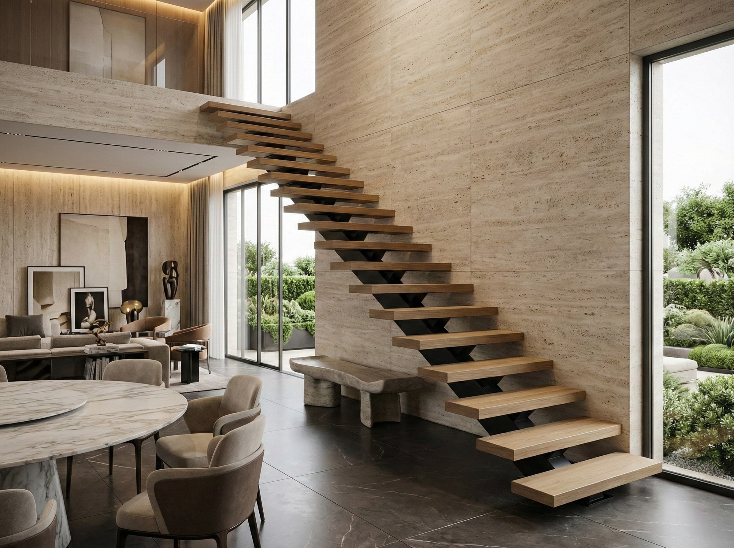 Advanced structural design for complex layouts, landings, and higher load requirements. Built with premium materials, precision fabrication, full railing systems, and integrated lighting.