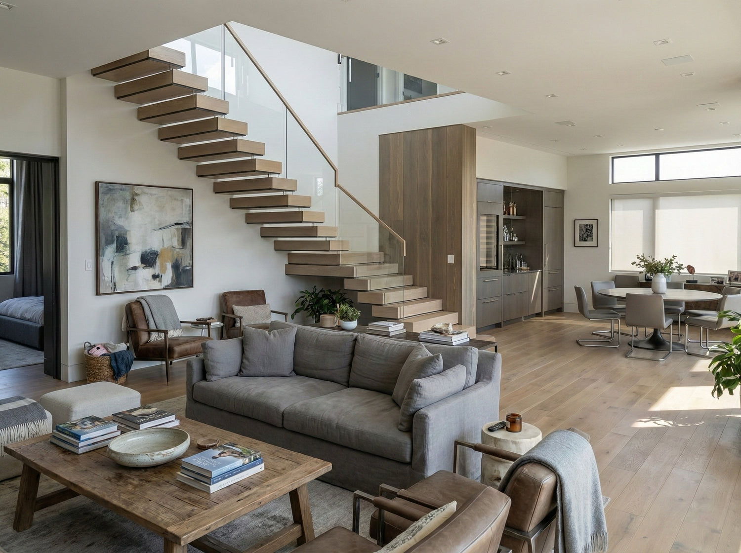 Straight-run floating stair systems with standard materials and finishes.